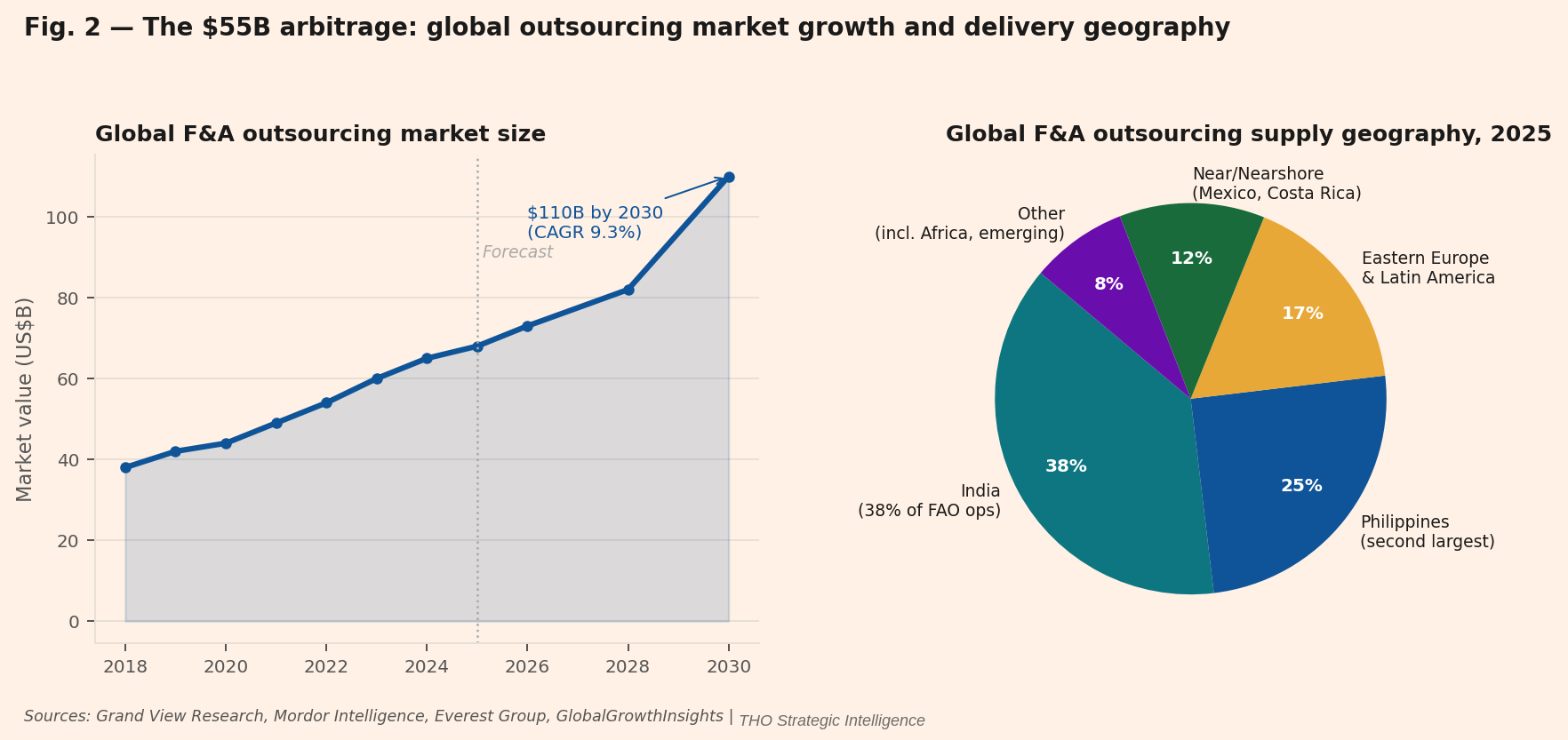 Left: global F&A outsourcing market ($B), 2018-2030 forecast. Right: delivery geography by share of outsourced operations, 2025. India handles 38% of global FAO. Asia-Pacific accounts for 46% of global delivery capacity. Data: Grand View Research, Mordor Intelligence, Everest Group, THO Strategic Intelligence.