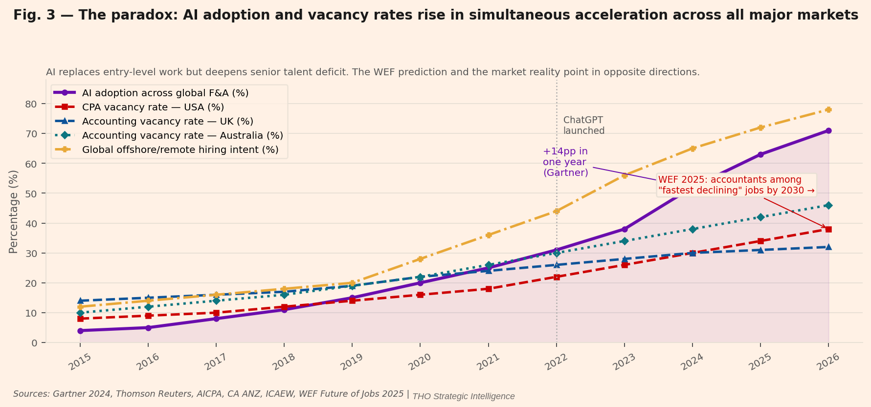 AI adoption across global F&A (purple); CPA/accounting vacancy rates for USA (red), UK (blue), Australia (teal); global offshore/remote hiring intent (amber). All rise simultaneously. The WEF 2025 prediction of “fastest declining” status is annotated. Data: Gartner, Thomson Reuters, AICPA, CA ANZ, ICAEW, WEF Future of Jobs 2025, THO Strategic Intelligence.