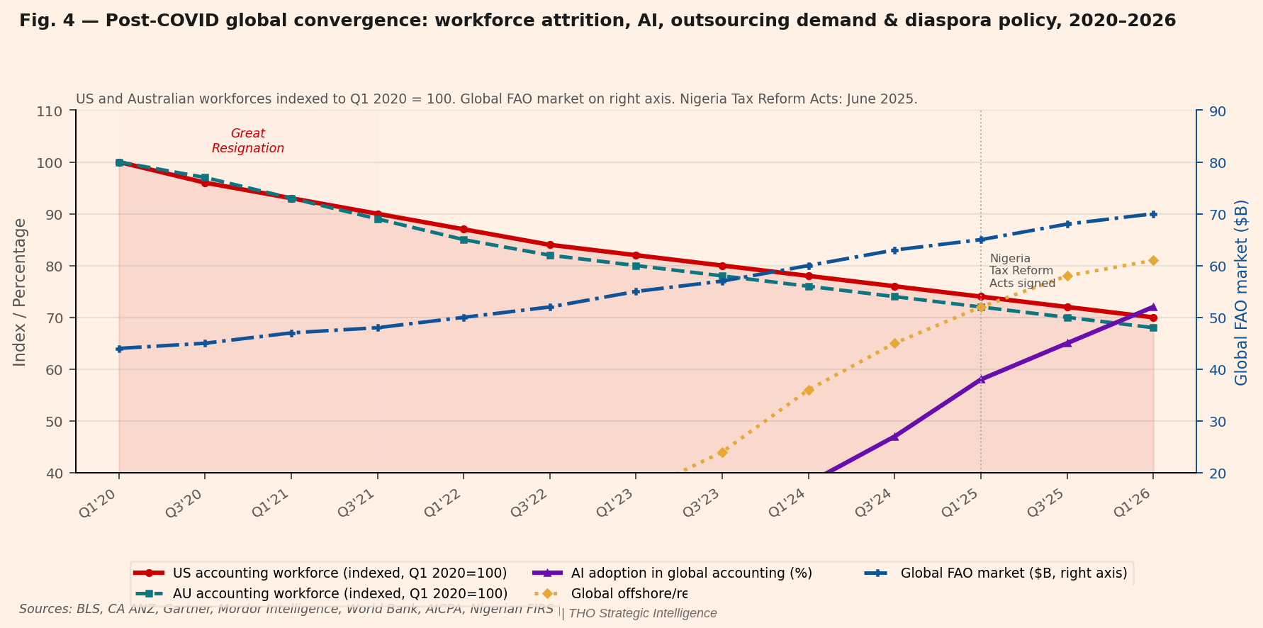 US and Australian workforces indexed to Q1 2020=100. AI adoption and offshore hiring intent as % of firms. Global FAO market ($B) on right axis. Nigeria Tax Reform Acts signed June 2025. Data: BLS, CA ANZ, Gartner, Mordor Intelligence, World Bank, AICPA, Nigerian FIRS, THO Strategic Intelligence.