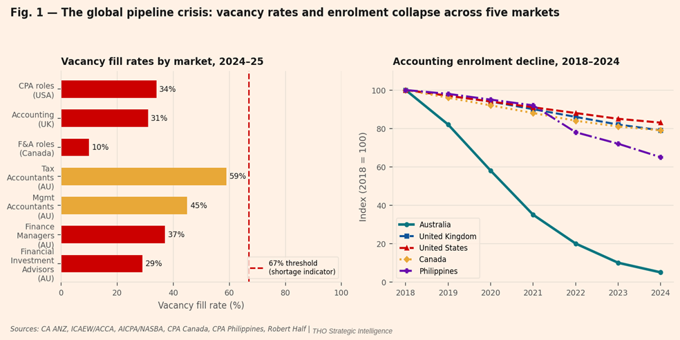 Left: vacancy fill rates by occupation and market (2024-25); the 67% threshold marks where Jobs & Skills Australia defines a shortage. Right: professional accounting enrolment indexed to 2018=100. Australia’s 95% collapse is without parallel. Data: CA ANZ, ICAEW/ACCA, AICPA, CPA Canada, CPA Philippines, Robert Half, THO Strategic Intelligence.